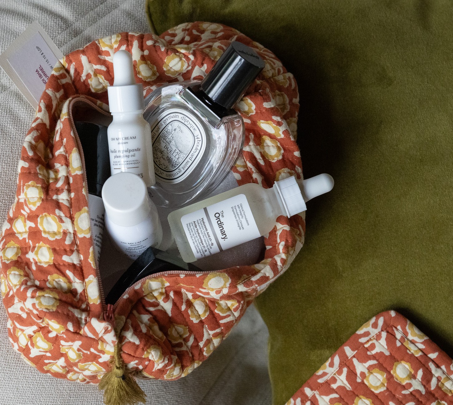 Καπιτονέ τσαντάκι καλλυντικών της Bonheur du Jour σε χρώμα τερακότα με μοτίβο λουλούδια.